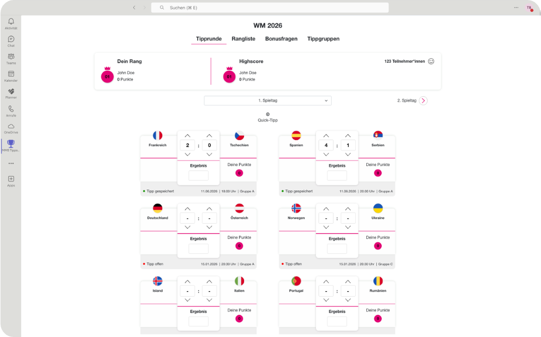 Teilnehmende können für jedes Spiel der WM ihren Tipp abgeben – bis zum Anpfiff der jeweiligen Partie.