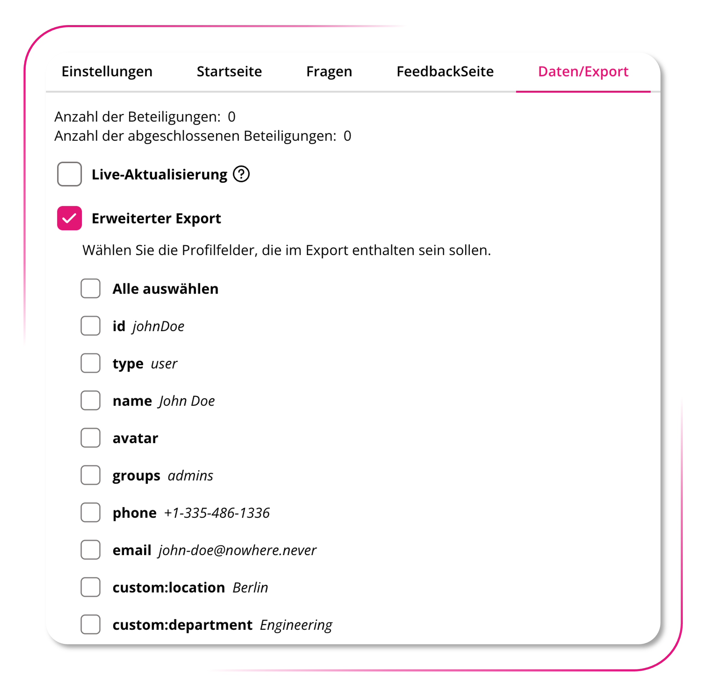 Auch bei anonymer Teilnahme behalten Sie die volle Flexibilität im Export: Editor:innen können auswählen, welche Profilfelder in den Export einfließen sollen – zum Beispiel Standort oder Abteilung. Bevor Mitarbeitende an der Umfrage teilnehmen, werden sie transparent darüber informiert und geben ihre ausdrückliche Zustimmung, dass diese ausgewählten Profilfelder gespeichert und für die Auswertung genutzt werden dürfen.