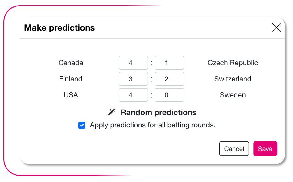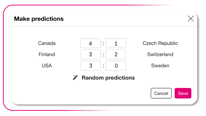 With the new “Random predictions” feature, users can have the prediction fields for games automatically filled with random values if they wish.
