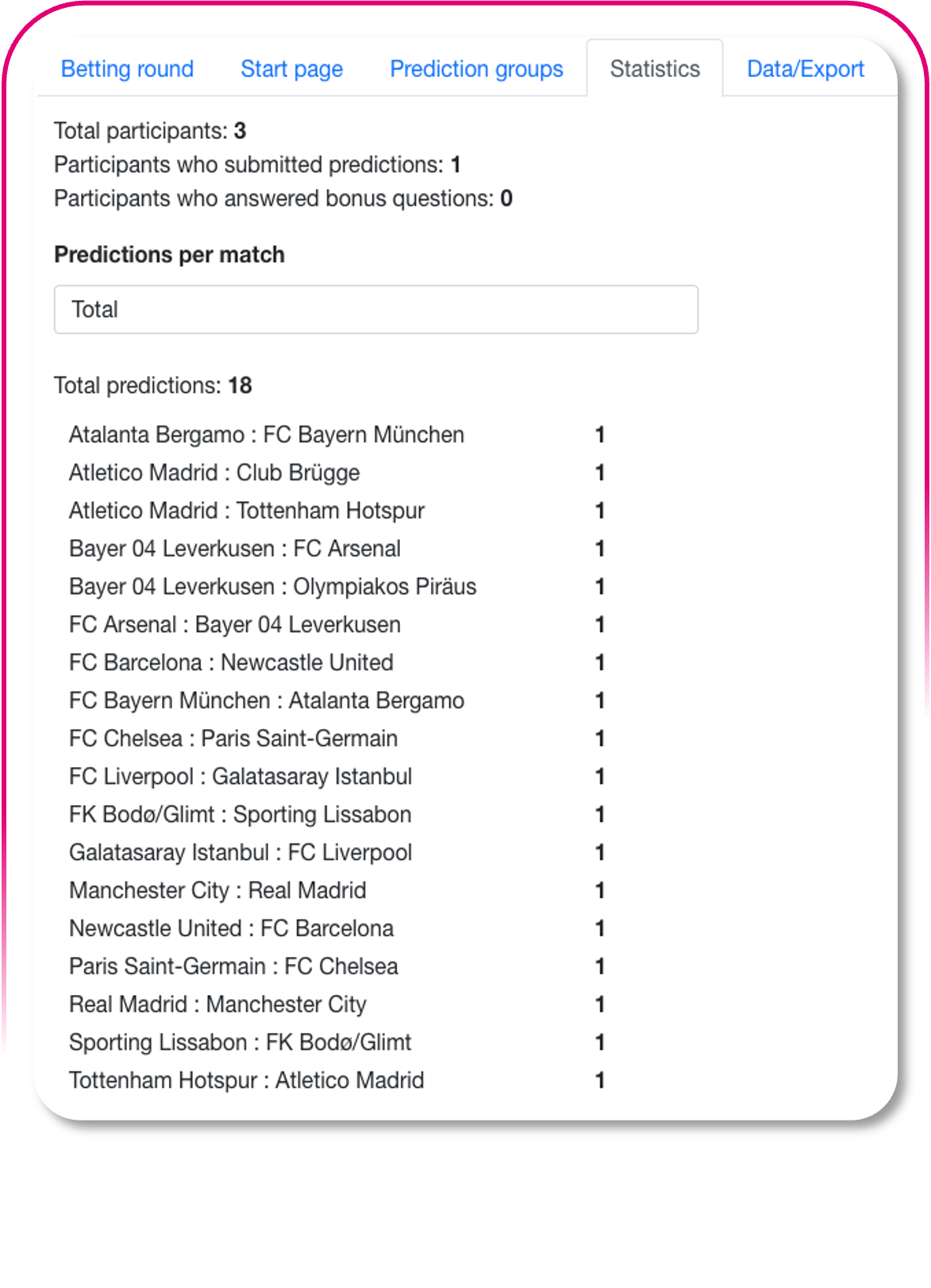 This allows you to analyse how many predictions have been submitted for each match – both in a clear overview for all matches in a competition and specifically for each match day.